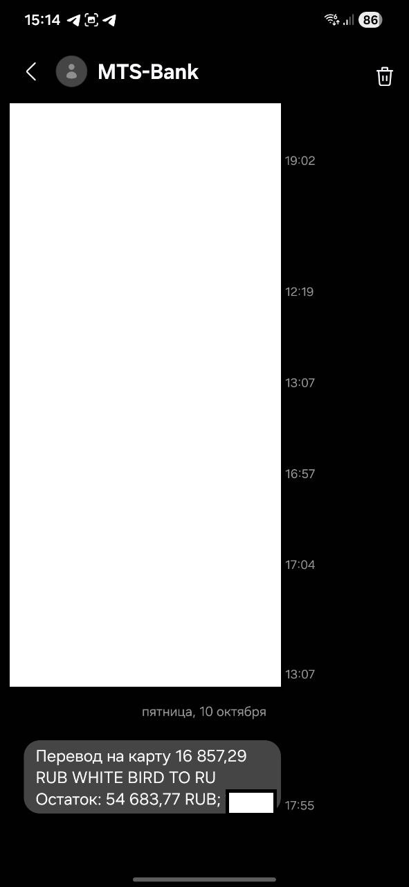 После обмена криптовалюты на рубли, фиатную валюту можно вывести к себе на карту или расчетный счет в любом банке РФ. Я для теста сделал вывод на карту МИР МТС банка. Вывод занял не более 2 минут. Поступление на карту приходит от WHITE BIRD TO RU. На этом этапе берется еще комиссия в 1,5% итоговый курс обмена USDT на RUB составил 79,36р.