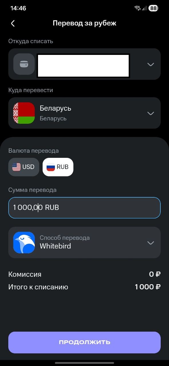 Пополнение крипто обменника Whitebird рублями РФ я выполнил через МТС банк, т.к. будет нулевая комиссия как со стороны банка так и со стороны обменника. Для этого заходим в приложение банка, открываем раздел ПЛАТЕЖИ, потом выбираем ПЕРЕВОДЫ ЗА РУБЕЖ, выбираем страну Беларусь и способ перевода Whitebird.