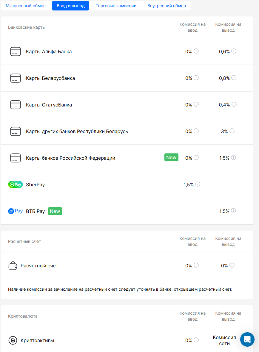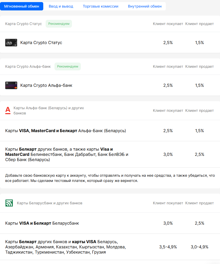 Основные способы ввода, вывода фиатных валют это банковские карты выпущенные банками Республики Беларусь, которые могут получить все жители стран СНГ (Беларусь, Россия, Украина, Грузия, Азербайджан, Армения, Казахстан, Кыргызстан, Молдова, Таджикистан, Туркменистан, Узбекистан и др.), т.к. за 250 BYN компания выпустит на ваше имя крипто карту Master Card от Альфа банка (Беларусь) и Статус банка.