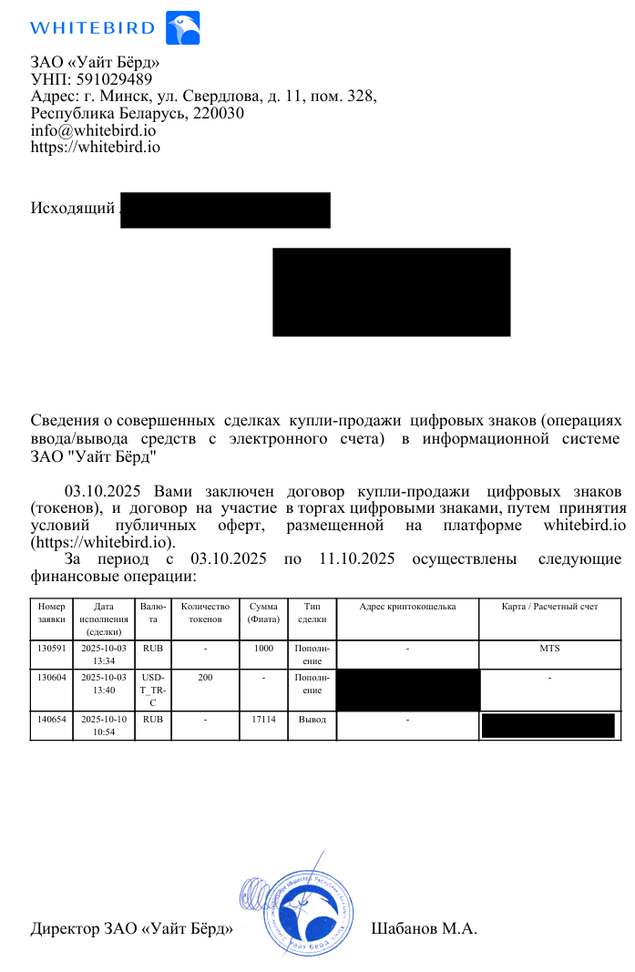 Для всех транзакций на Whitebird можно запросить справку для предоставления в налоговую службу. Справка выглядит следующим образом: