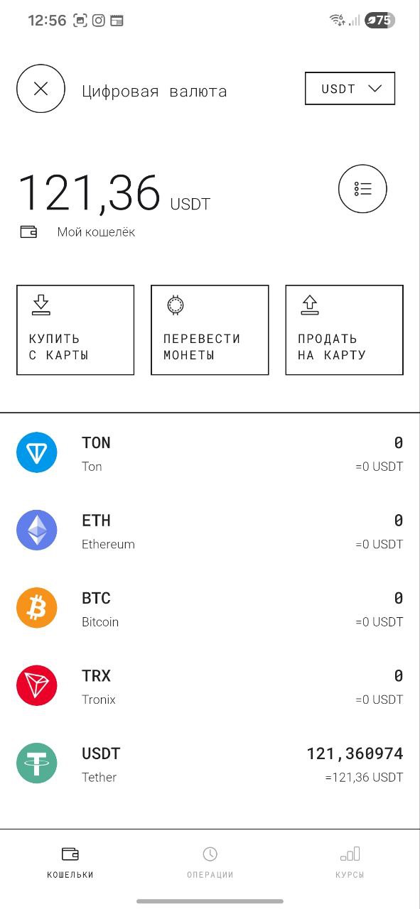 Для операций с крипто активами доступны следующие монеты: BTC, ETH, TRX, TON и USDT ERC-20
