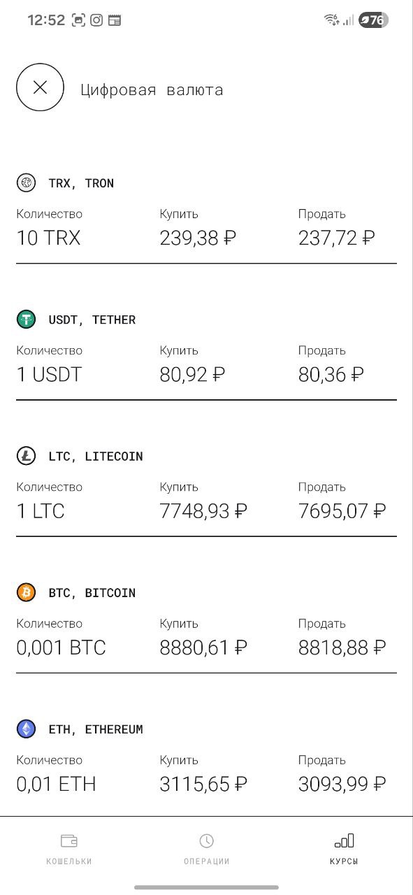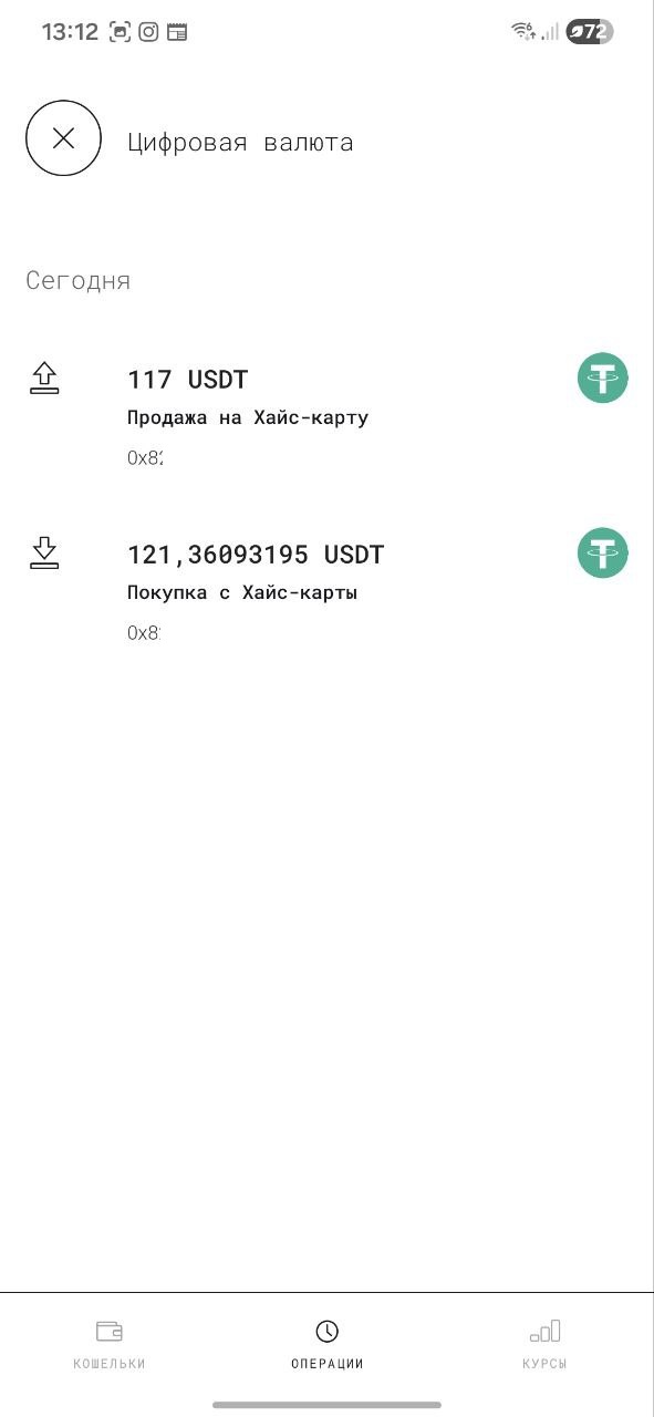 В разделе цифровые активы есть меню Курсы, но показываемые в этом разделе курсы обмена криптовалют не совпадают с реальными по которым Вам будет произведен обмен и реальные курсы обмена будет менее выгодные. Что бы узнать реальный курс обмена нужно зайти в раздел купить с карты или продать с карты. На вашей карте Хайс должно быть минимальный баланс 1000 рублей, что бы узнать реальный курс обмена рублей на крипто доллар USDT. А что бы узнать обратный курс обмена USDT на рубли, то на балансе в приложении Цифровые активы должно быть не меньше 12 USDT, иначе приложение просто выдает ошибку о недостаточности баланса для обмена.