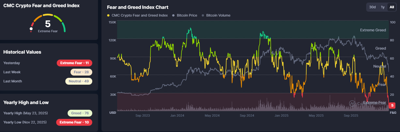 Индекс страха и жадности упал до уровня «крайнего страха»- до 5. Значение страха на уровне 5 не наблюдалось за последние несколько лет, возможно это даже самое минимальное значение индекса за всю историю существования этого индекса.